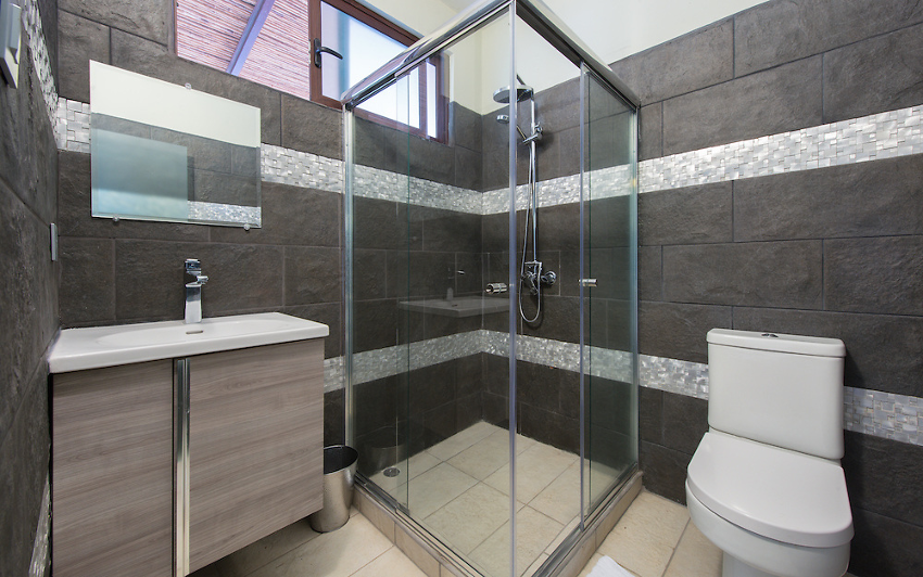 The door separating the bedroom from the ensuite bathroom is of tinted security glass, which makes the room look modern within its other rustic features. The bathroom has a very contemporary design with unique black tiles combined with silver strips. There is plenty of cupboard space to store toiletries and the large window allows natural light and fresh air to come in.
