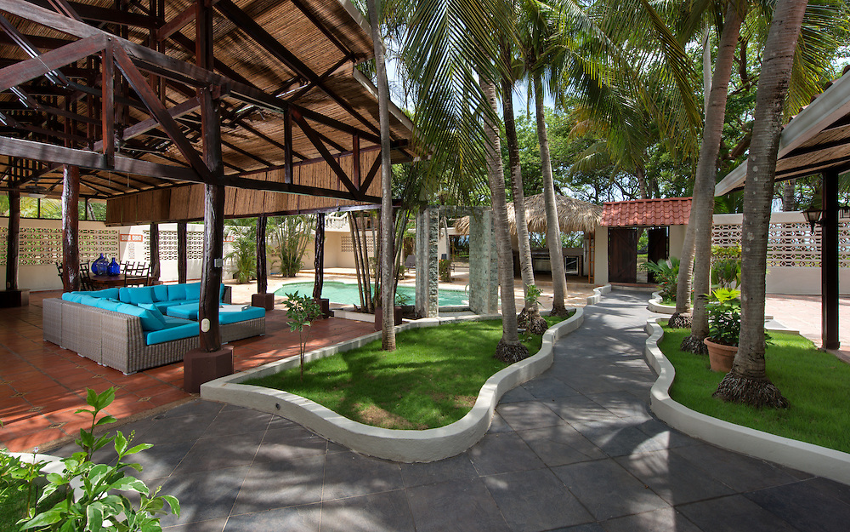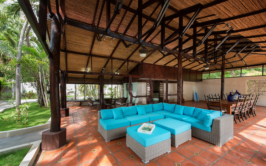 This area is built under the cover of a majestic ceiling and enjoys beautiful views over the swimming pool and BBQ area, as well as to the tropical gardens and Pacific Ocean. The area is open-sided making it very easy to access from all parts of the house, and also keeping it very fresh and serene with cooling sea breezes that flow in from the ocean. As the open-air living room overlooks the swimming pool, young children can be monitored at all times.
